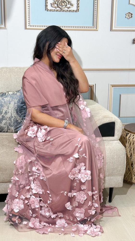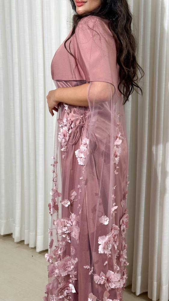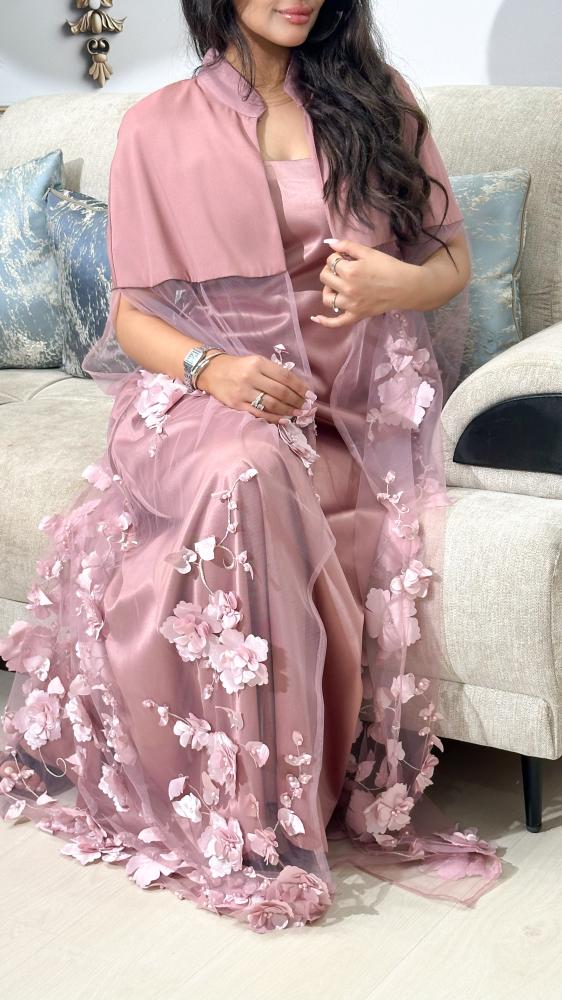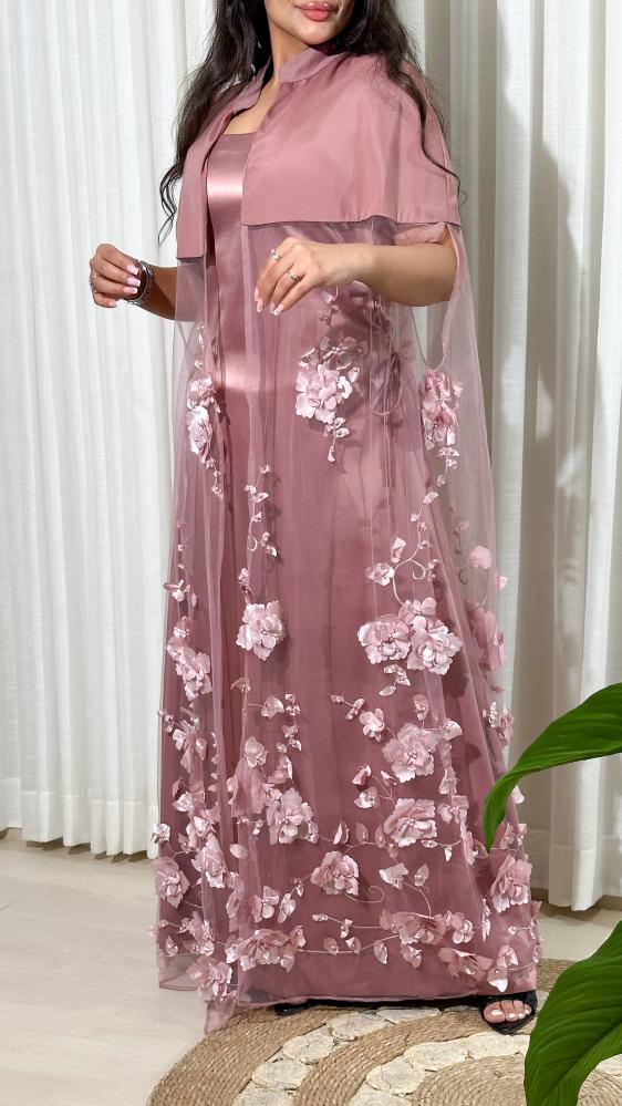 جلابية انيقة وتصميم فاخر باللون الوردي الغامق من الوان الصيف عبارة عن قطعتين القطعة الاولى رداء من التل المزين بالورود البارزة على كامل القطعة مع الفستان الداخلي الذي يمكن التحكم بالقياس من الجنبين قطعة مميزة وأنيقة وتصميم انثوي