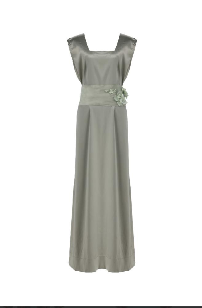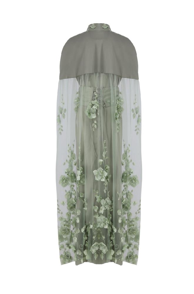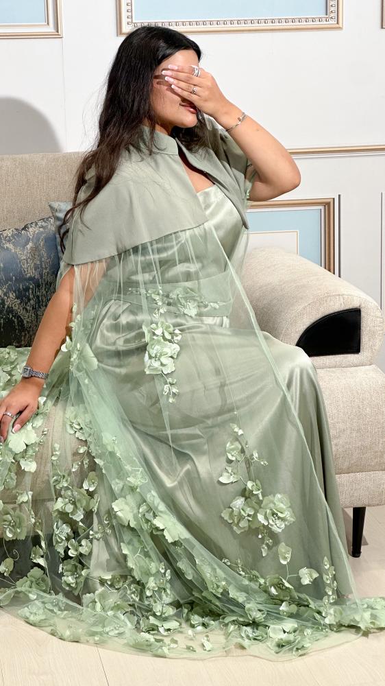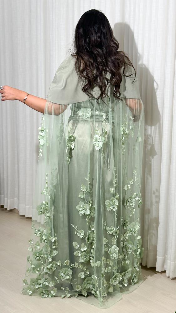 جلابية بتصميم يجمع بين الرقي والنعومة بلون أخضر باستيل هادئ من خامة الحرير ويتكون من قطعة داخلية الفستان الاساسي مع رداء من التل المطرز بالورود ثلاثية الابعاد المتناثرة على كامل القطعة