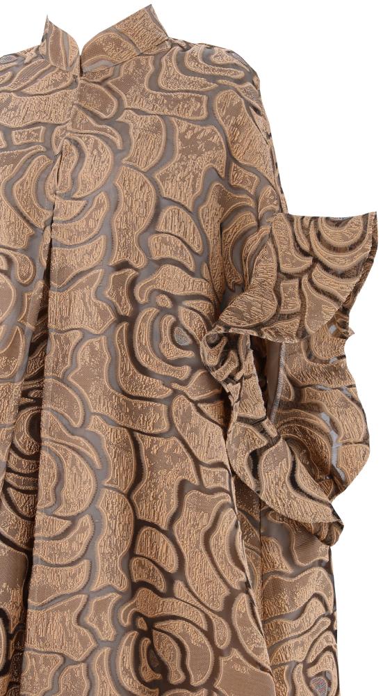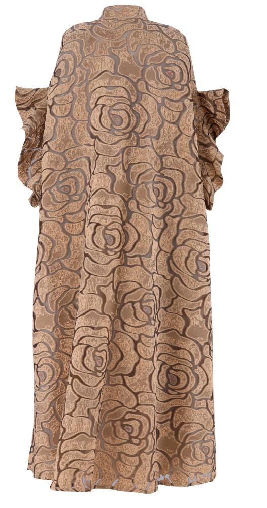 الجلابية تم تصميمها برقبة مرتفعة وبتصميم الكيب وطيات من القماش على فتحة اليدين من الجانبين