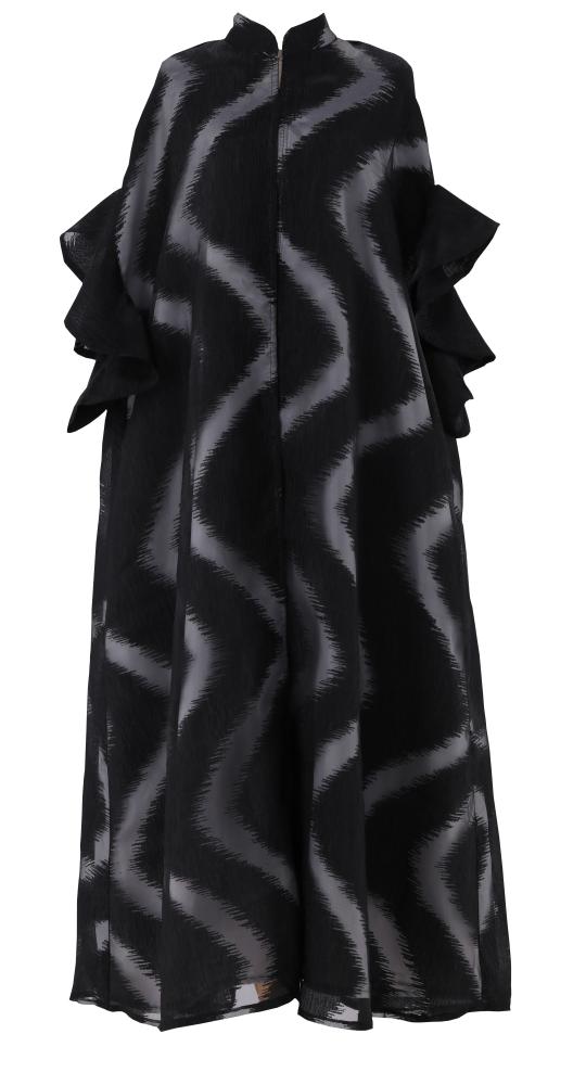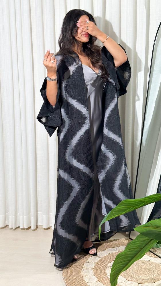 جلابية أنيقة مناسبة للاجواء الرمضانية تم استخدام قماش الجاكارد والاورجنز ا المموج باللون الاسود الخامة خفيفة ومصممة بطابع الكيب يمكن ارتداؤه مع الفستان الداخلي باللون الاسود او لون السلفر