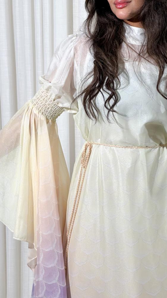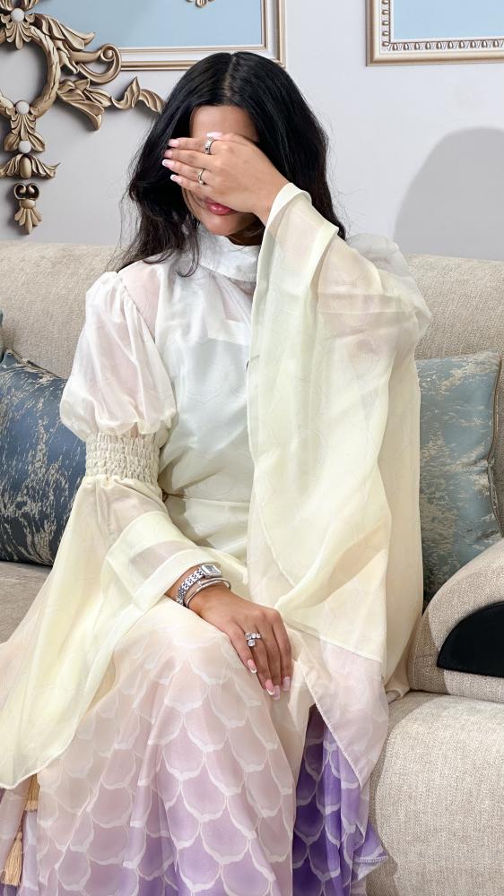 جلابية أنثوية أنيقة بتصميم عصري تأتي بلون فاتح ناعم يتدرج من الأبيض الكريمي إلى درجات الخوخ والبنفسجي،
