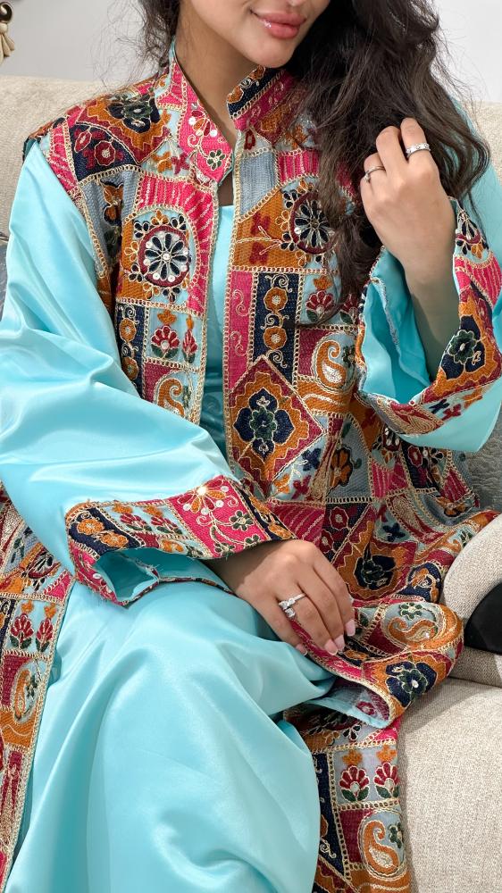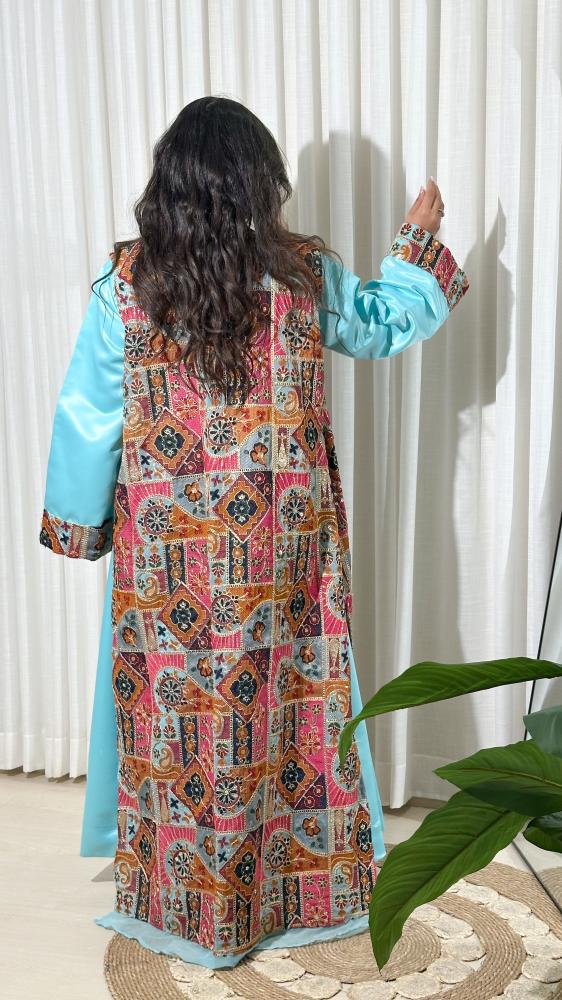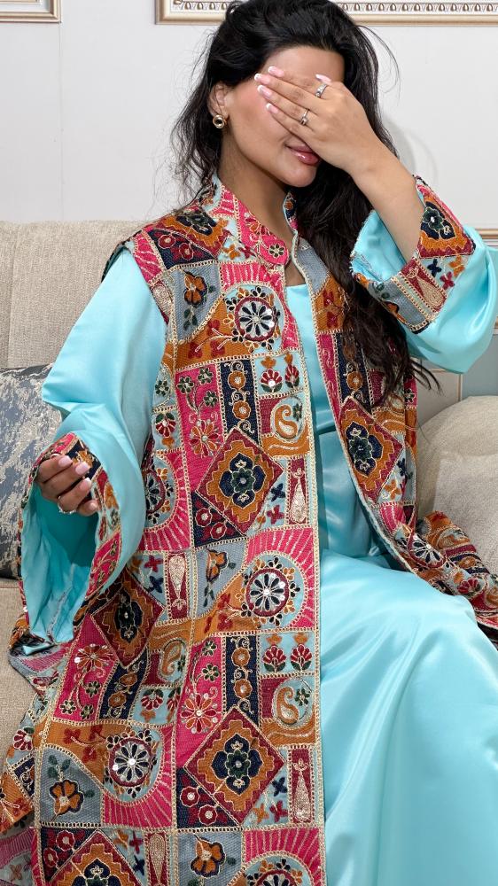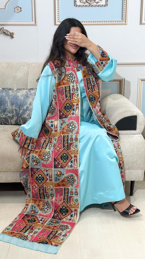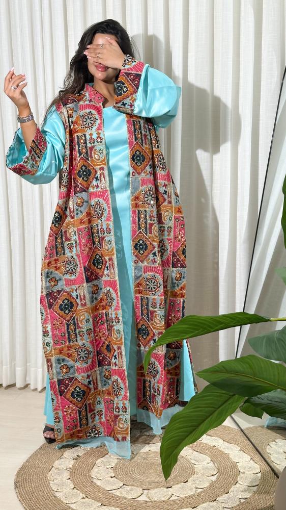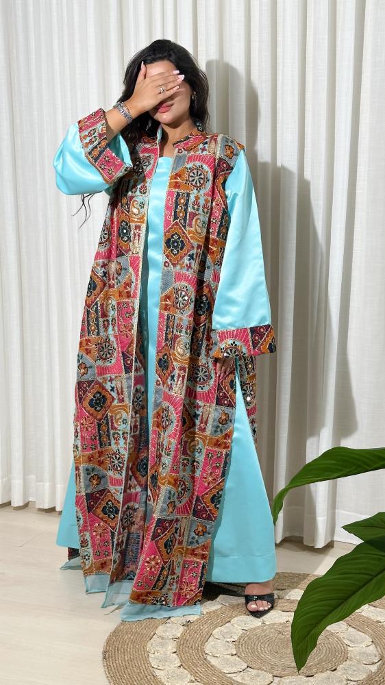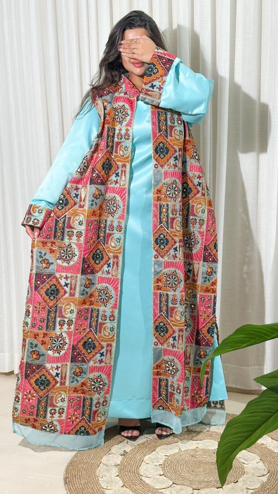 جلابيات تراثية سعودية من قطعتين تجمع بين عبق التراث وروح الأناقة الحديثة. صُممت بعناية لتجعل كل إطلالة لوحة فنية نابضة بالألوان والتفاصيل. الفستان الداخلي باللون التركواز الفاتح يعكس الصفاء والهدوء، فيما تزيّنت القطعة الخارجية بنقش الزخارف التراثية الغنية التي تعكس جمال الفنون الشرقية. القصّة الواسعة والأكمام المطرزة تضفي حضورًا ملكيًا، بينما تمنحك الربطات الداخلية تحكمًا ممتازًا بالقياس لتلائم جميع الأذواق. هذه الجلابية هي تحفة فنية تليق بمناسباتك الخاصة وجلساتك الأنيقة.
