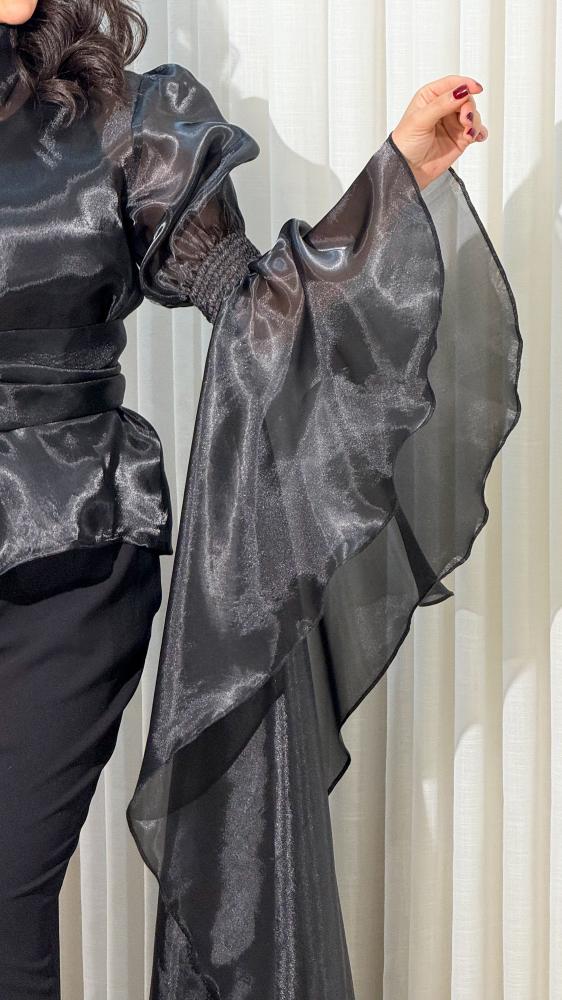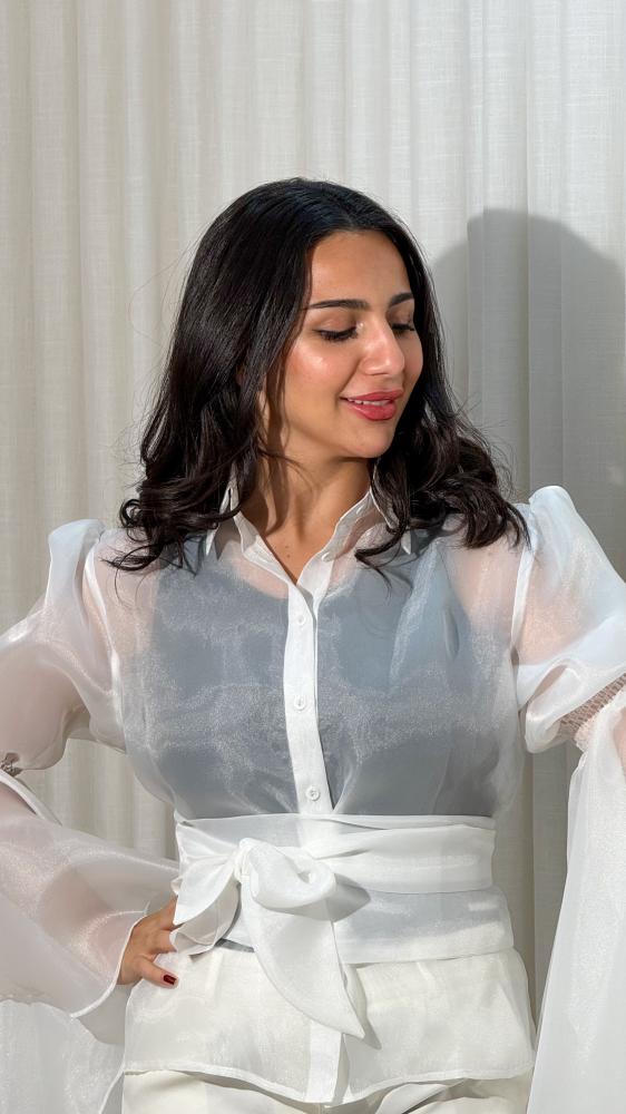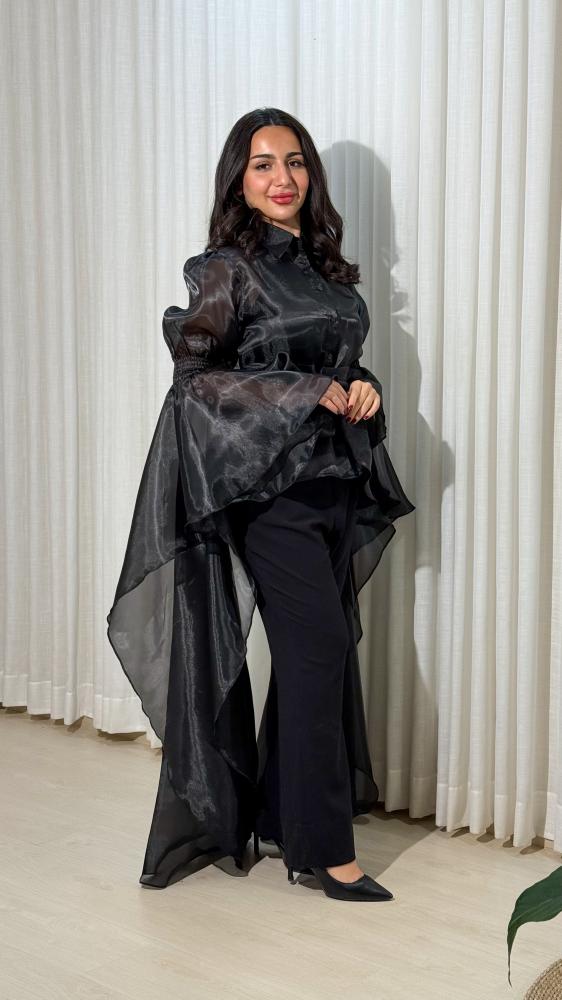 بلوزة بتصميم انيق من قماش الاورجنزا شبة شفافه والبلوزة تصميم كلاسيكي رسمي مع اكمام واسعة عند الكتف وتتميز الاكمام بتصميم فريد تنتهي في المنتصف بكم ضيق يتوسع لوجود المطاط وتنسدل منه قطعة طويلة متموجة